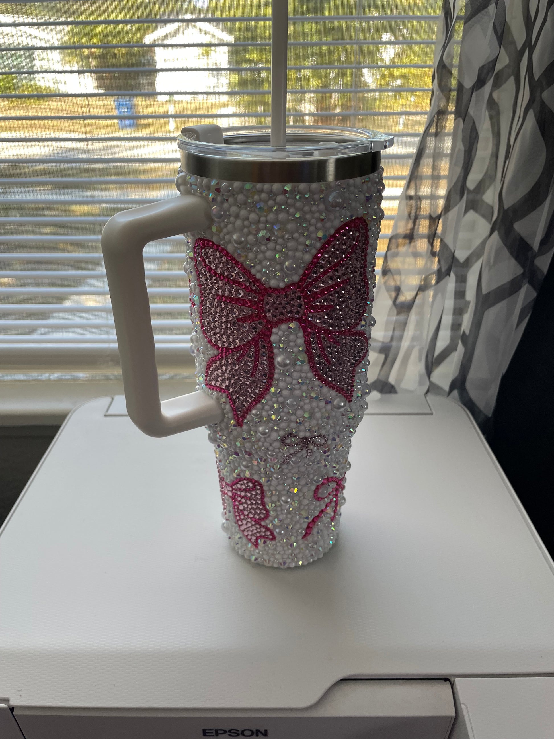 The materials required to create this design, including the price of the authentic Stanley Tumbler cost, is about $150+, depending on color and type of pearl and rhinestones used. The time it takes to hand place this design is about 15 hours.
