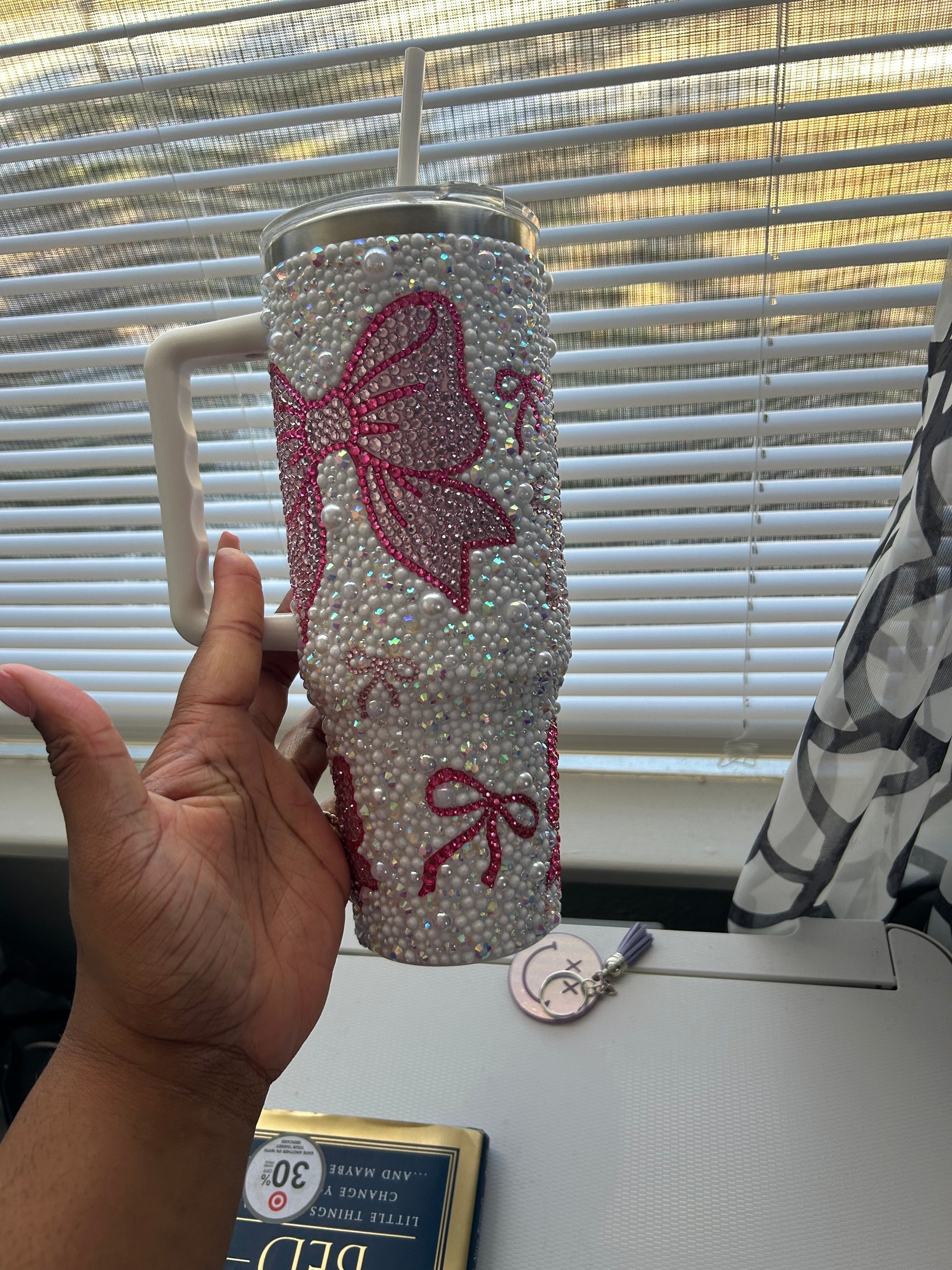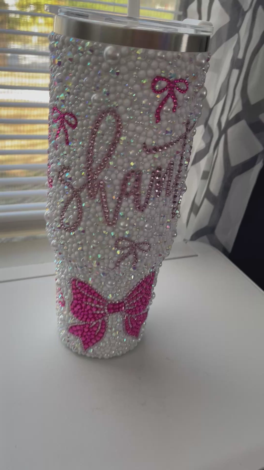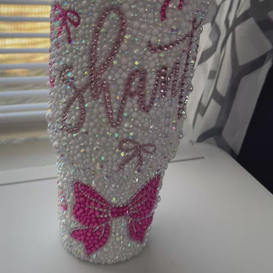 Elevate your everyday sip with this handmade, full-coverage pearl and rhinestone tumbler, designed for those who love bold sparkle and luxury detail. Each cup is meticulously crafted using a mix of high-quality pearls and shimmering rhinestones, individually placed by hand to create a stunning, one-of-a-kind finish.